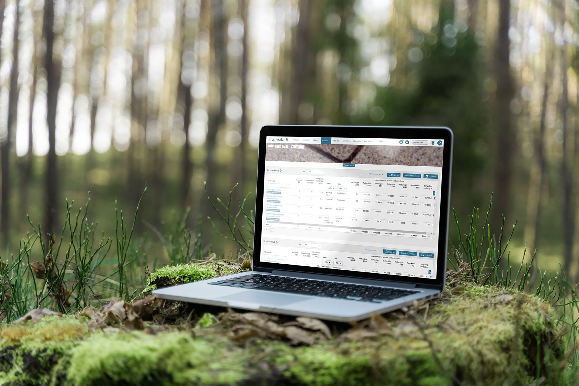 Utviklingen av funksjonaliteten skjer derfor i tett samarbeid med en aktiv gruppe av pilotkommuner. Klimabudsjett er i Framsikt lagt inn som en del av den ordinære økonomiplan- og budsjettprosessen, i tråd med anbefalingene fra den nasjonale veilederen. Klimastatistikk hentes enkelt ut i Analysemodulen. Klimabudsjettet lages i Økonomiplanmodulen, hvor mål og tiltak for å nå klimamålene defineres. Klimatiltakene kan deretter følges opp i Virksomhetsplanmodulen og rapporteres på i Rapporteringsmodulen.